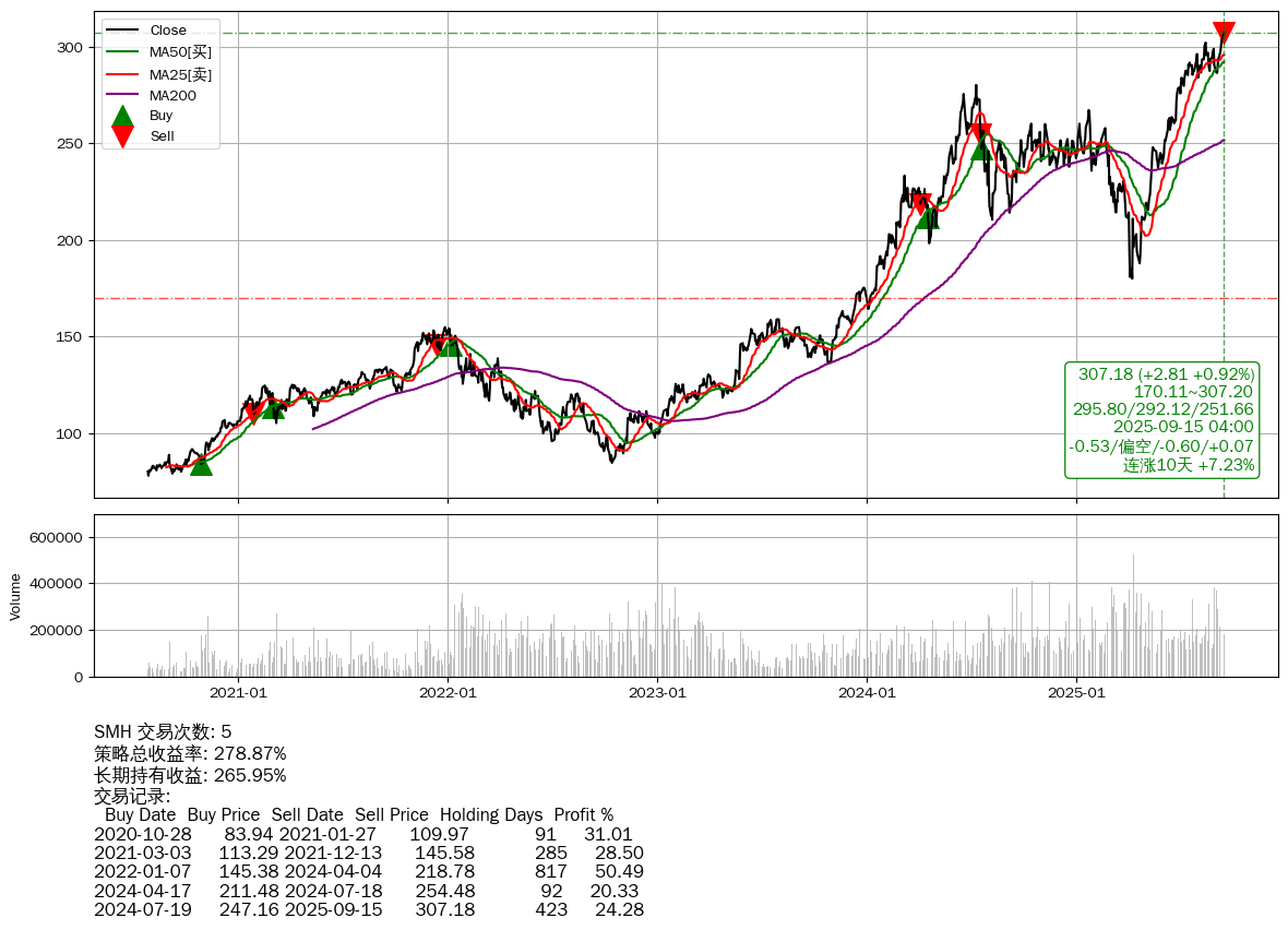 | 11 | ★SMH | +278.87% | +265.95% | +12.92% | 5 | -0.53/偏空/-0.60/+0.07 | 2020-07-27~2025-09-15 |