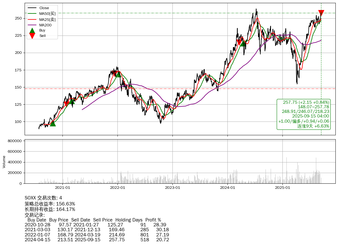 | 27 | ★SOXX | +156.63% | +164.17% | -7.54% | 4 | +1.00/偏多/+0.94/+0.06 | 2020-07-27~2025-09-15 |