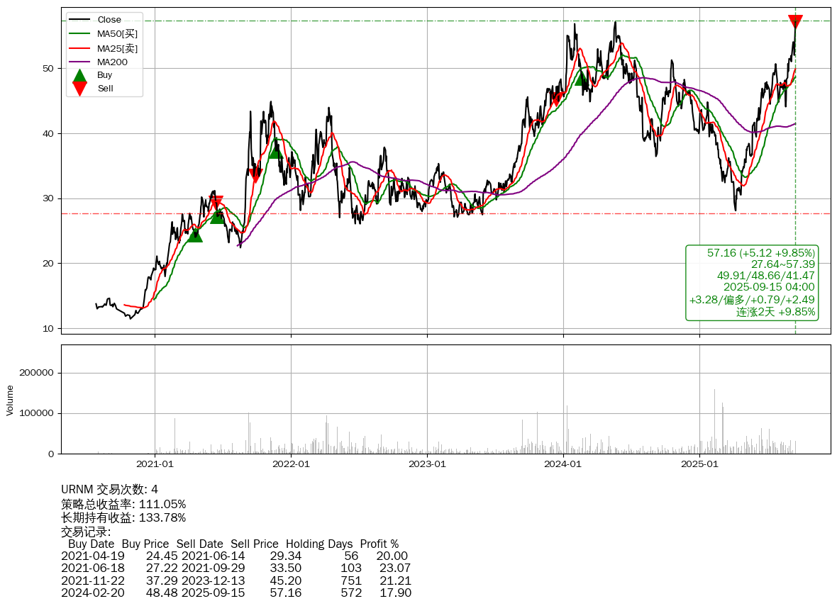 | 40 | ★URNM | +111.05% | +133.78% | -22.73% | 4 | +3.28/偏多/+0.79/+2.49 | 2020-07-28~2025-09-15 |