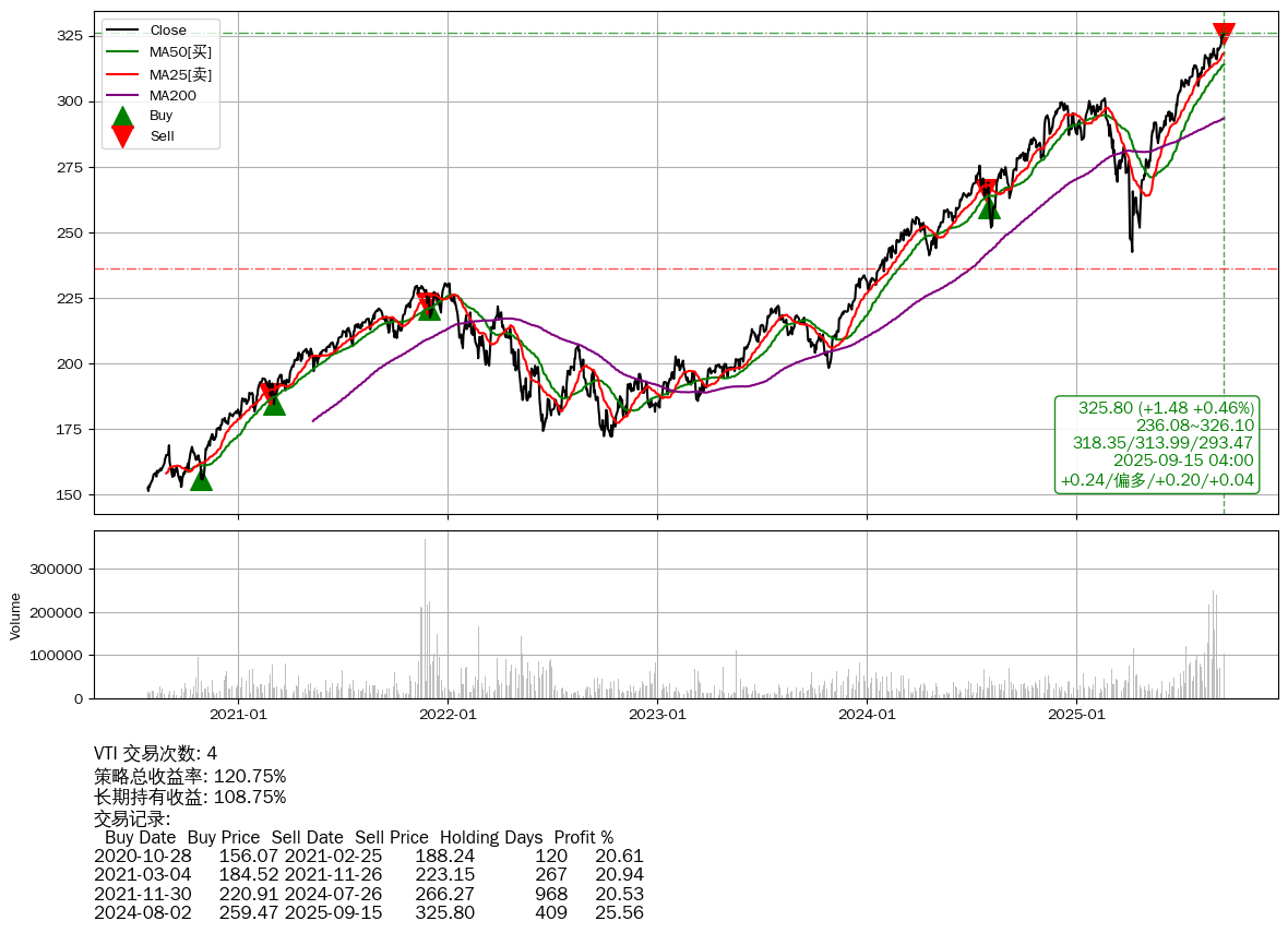 | 36 | ★VTI | +120.75% | +108.75% | +12.00% | 4 | +0.24/偏多/+0.20/+0.04 | 2020-07-27~2025-09-15 |