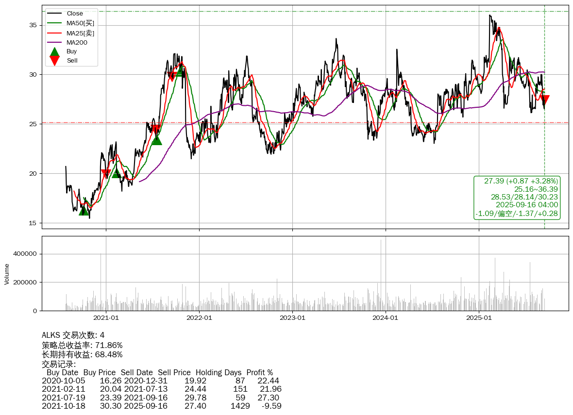 | 46 | 🟢ALKS | +71.86% | +68.48% | +3.38% | 4 | -1.09/偏空/-1.37/+0.28 | 2020-07-27~2025-09-16 |