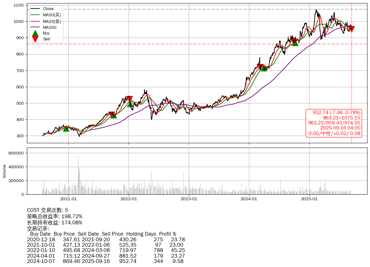 | 13 | ★COST | +198.72% | +174.08% | +24.64% | 5 | -0.05/中性/+0.02/-0.08 | 2020-07-27~2025-09-16 |
