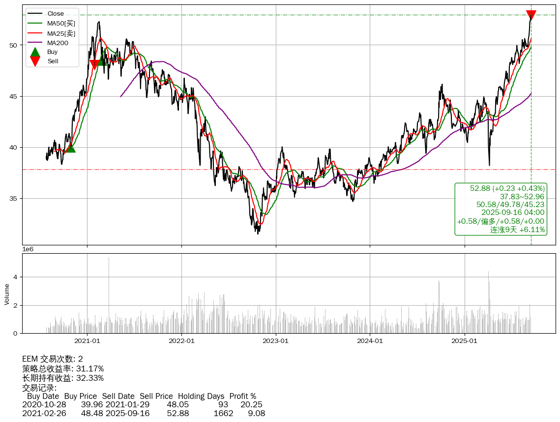 | 58 | ★EEM | +31.17% | +32.33% | -1.16% | 2 | +0.58/偏多/+0.58/+0.00 | 2020-07-27~2025-09-16 |