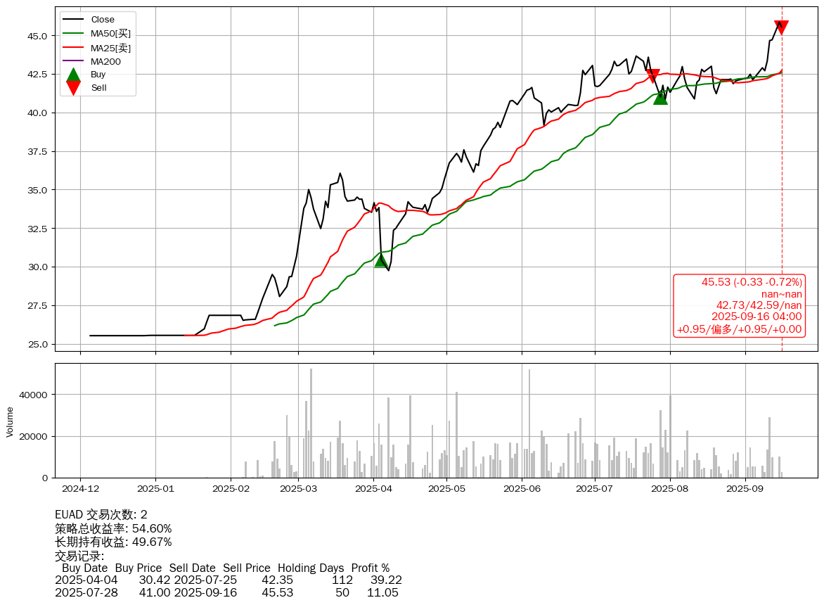 | 53 | ★EUAD | +54.60% | +49.67% | +4.93% | 2 | +0.95/偏多/+0.95/+0.00 | 2024-12-05~2025-09-16 |