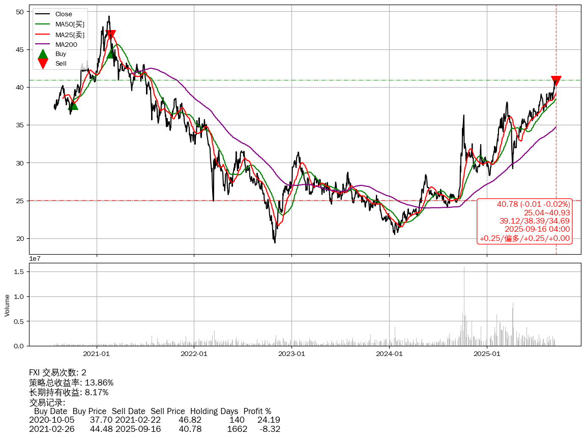 | 60 | ★FXI | +13.86% | +8.17% | +5.69% | 2 | +0.25/偏多/+0.25/+0.00 | 2020-07-27~2025-09-16 |