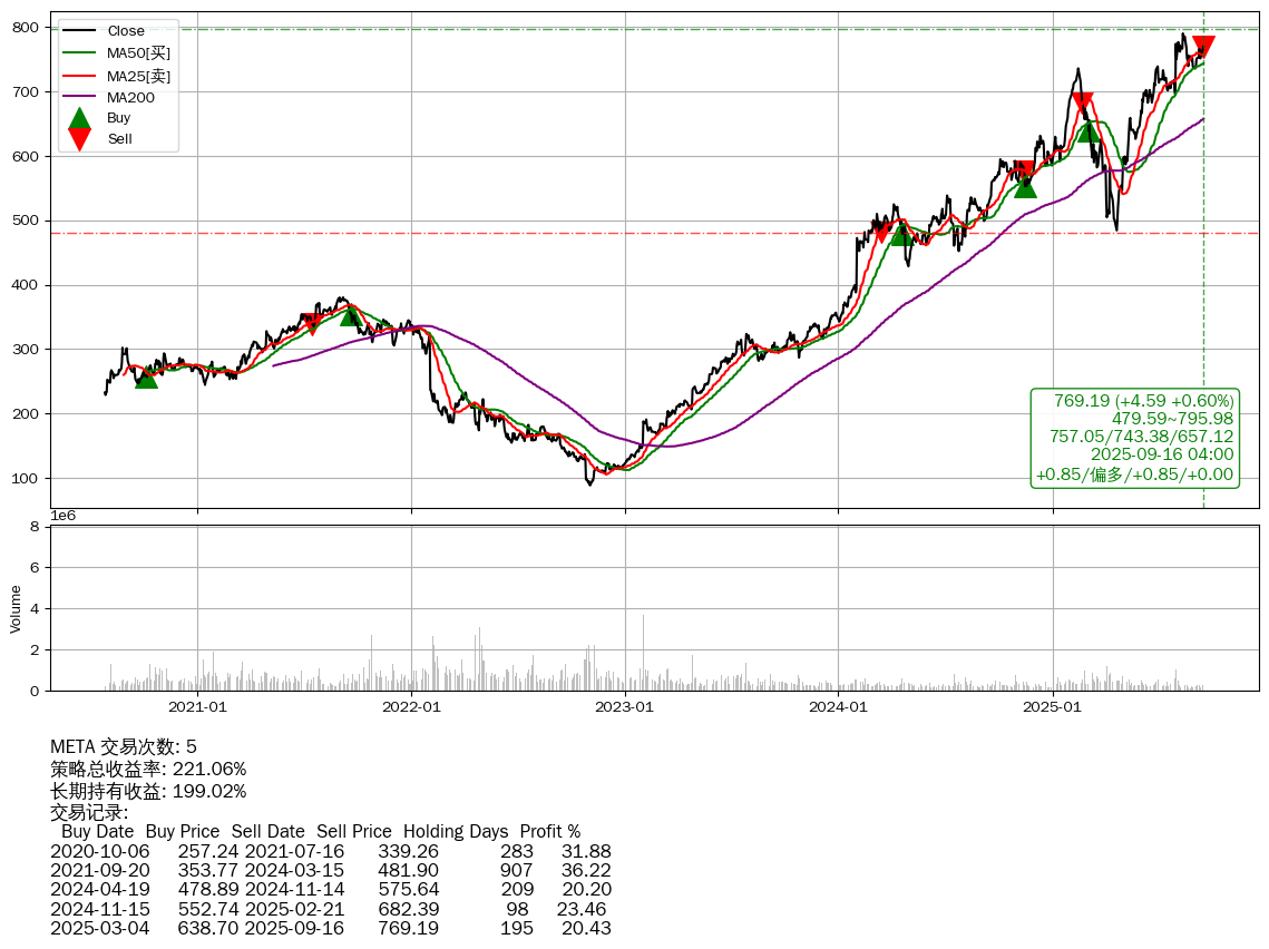 | 11 | ★META | +221.06% | +199.02% | +22.04% | 5 | +0.85/偏多/+0.85/+0.00 | 2020-07-27~2025-09-16 |