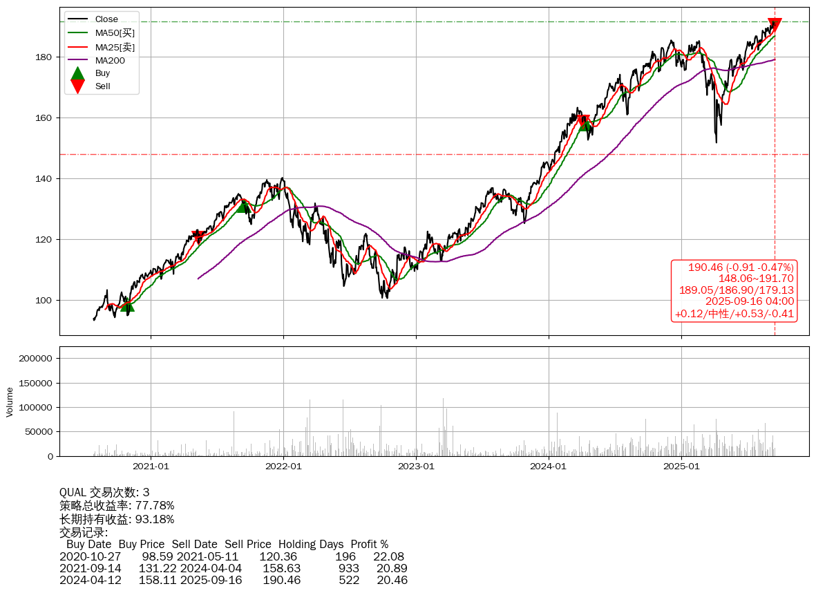 | 42 | ★QUAL | +77.78% | +93.18% | -15.41% | 3 | +0.12/中性/+0.53/-0.41 | 2020-07-27~2025-09-16 |