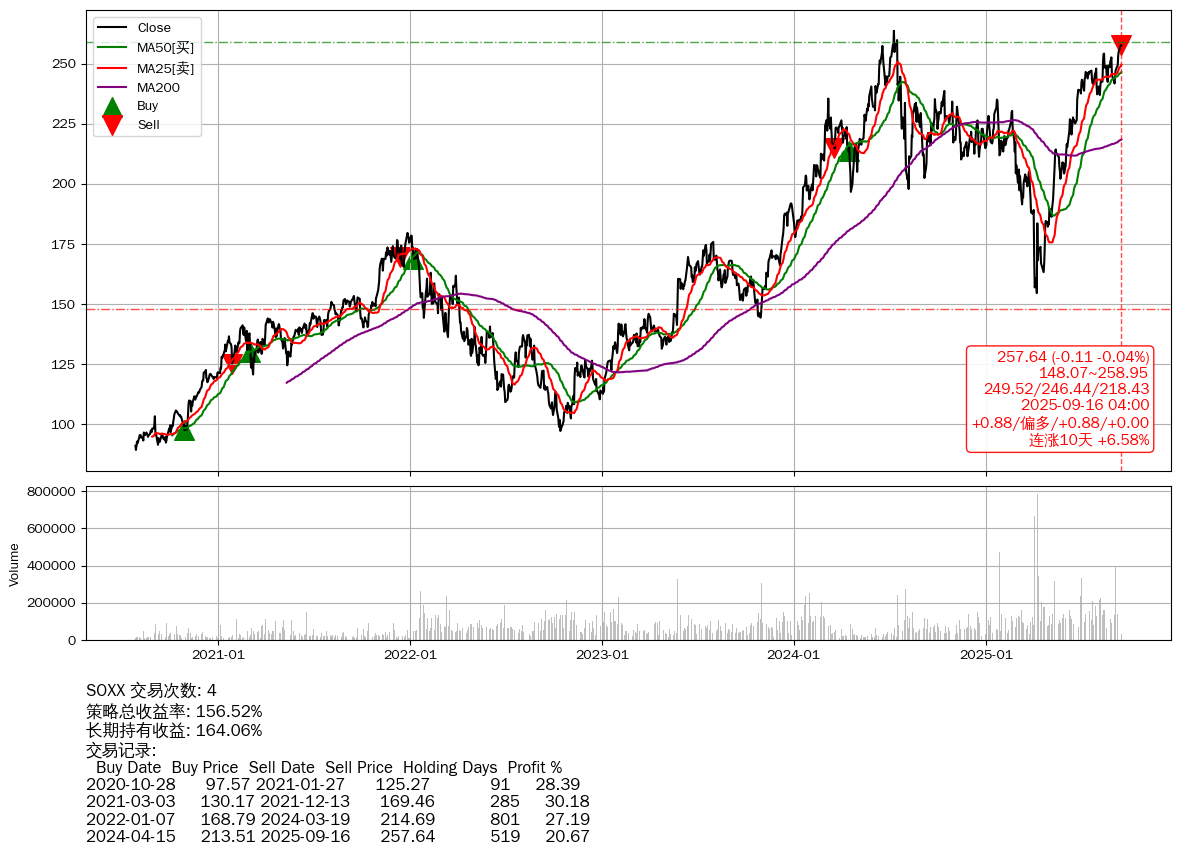 | 21 | ★SOXX | +156.52% | +164.06% | -7.53% | 4 | +0.88/偏多/+0.88/+0.00 | 2020-07-27~2025-09-16 |