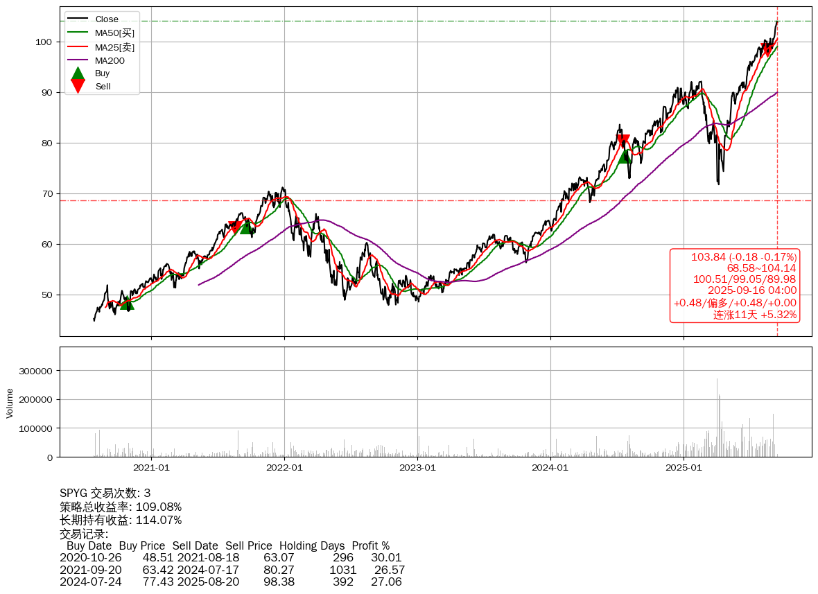 | 32 | ★SPYG | +109.08% | +114.07% | -4.99% | 3 | +0.48/偏多/+0.48/+0.00 | 2020-07-27~2025-09-16 |