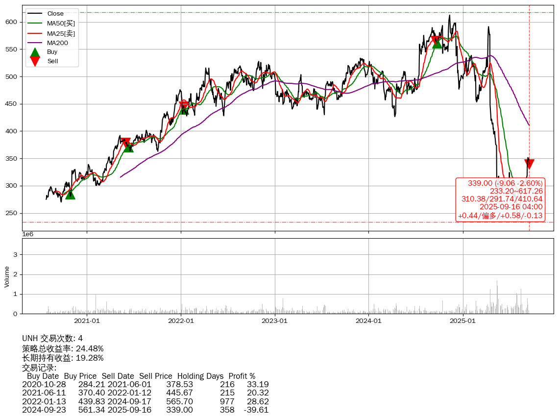 | 59 | ★UNH | +24.48% | +19.28% | +5.20% | 4 | +0.44/偏多/+0.58/-0.13 | 2020-07-27~2025-09-16 |