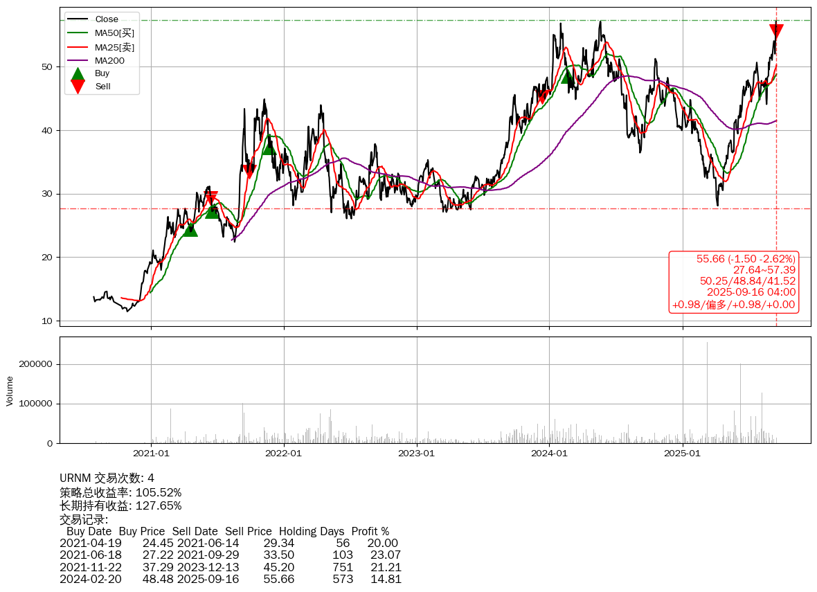 | 33 | ★URNM | +105.52% | +127.65% | -22.13% | 4 | +0.98/偏多/+0.98/+0.00 | 2020-07-28~2025-09-16 |