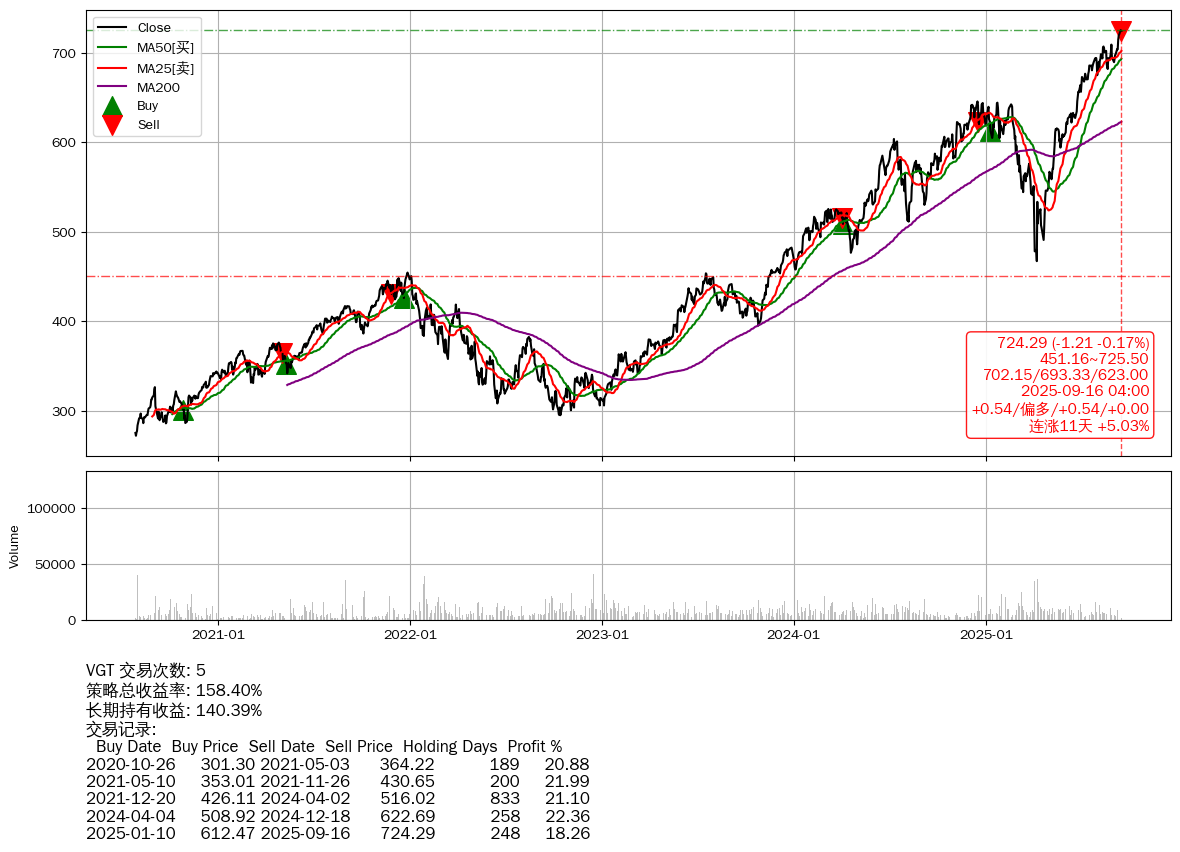 | 19 | ★VGT | +158.40% | +140.39% | +18.02% | 5 | +0.54/偏多/+0.54/+0.00 | 2020-07-27~2025-09-16 |