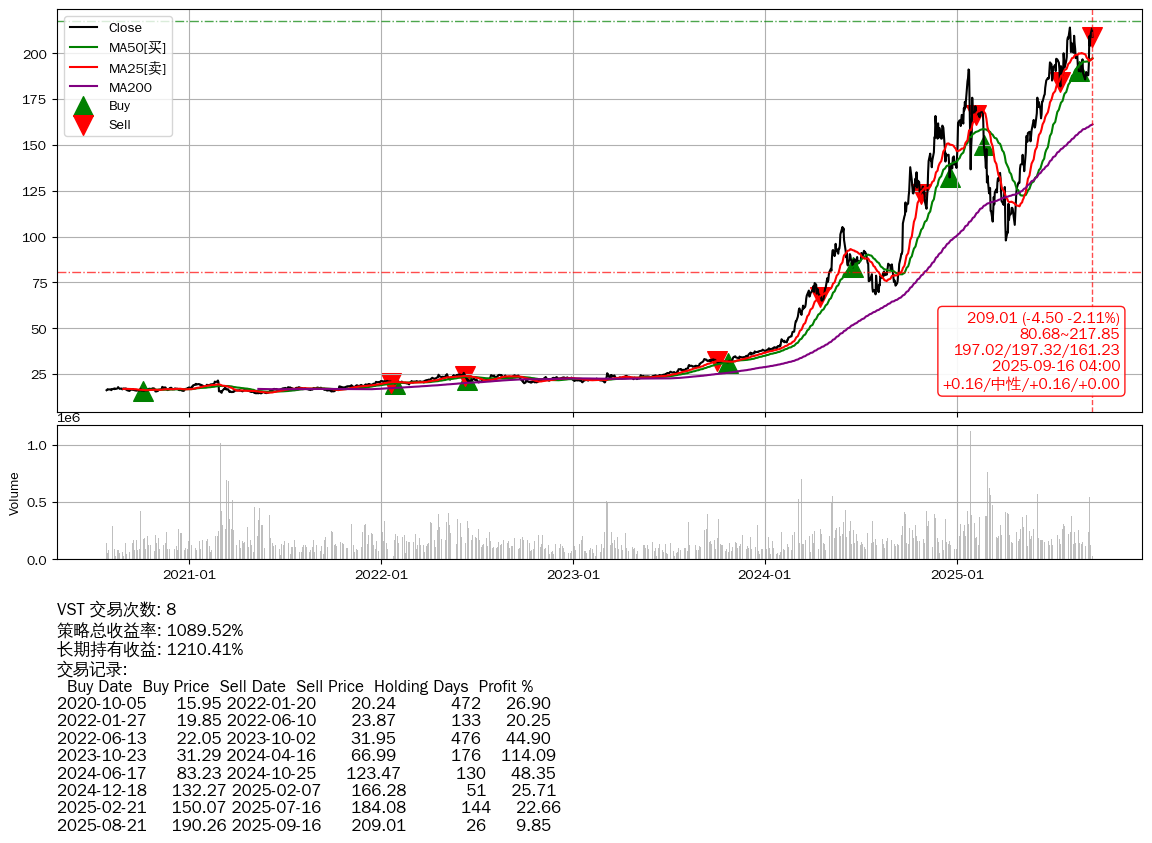 | 2 | ★VST | +1089.52% | +1210.41% | -120.89% | 8 | +0.16/中性/+0.16/+0.00 | 2020-07-27~2025-09-16 |