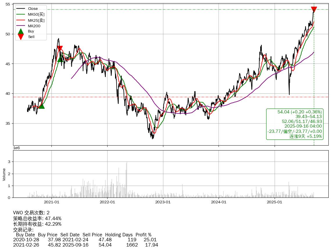 | 56 | ★VWO | +47.44% | +42.29% | +5.15% | 2 | -23.77/偏空/-23.77/+0.00 | 2020-07-27~2025-09-16 |