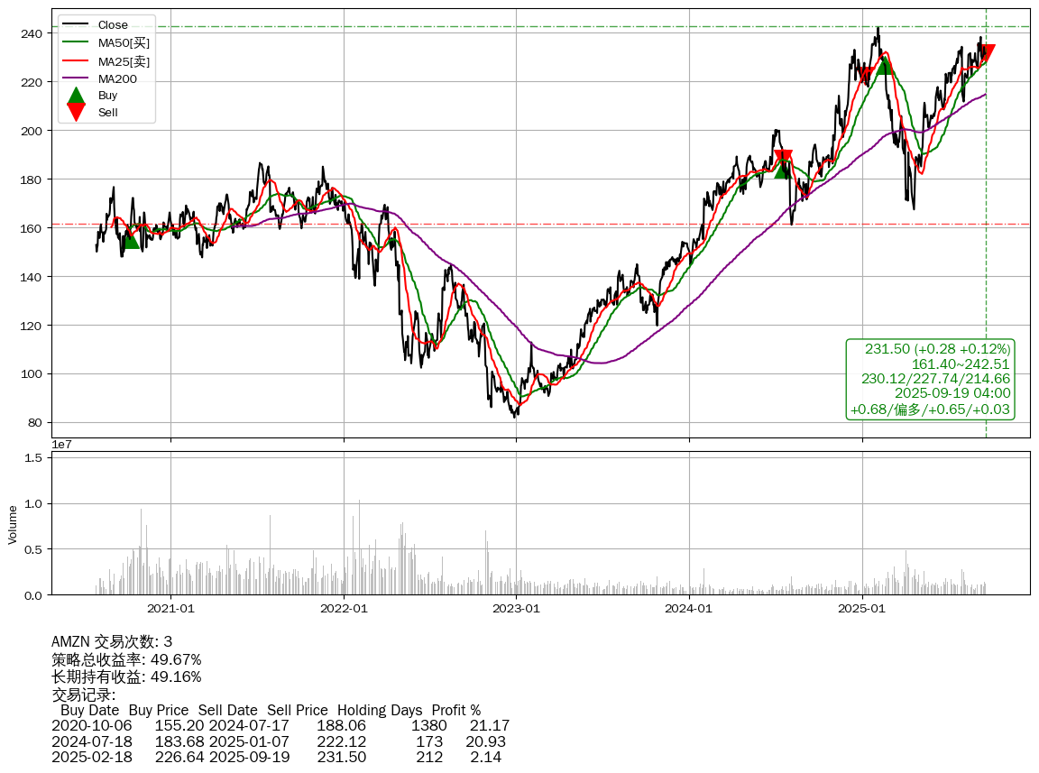 | 71 | ★AMZN | +49.67% | +49.16% | +0.50% | 3 | +0.68/偏多/+0.65/+0.03 | 2020-07-27~2025-09-19 |