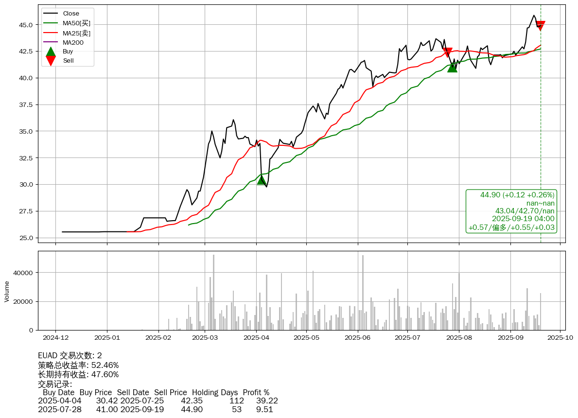 | 68 | ★EUAD | +52.46% | +47.60% | +4.86% | 2 | +0.57/偏多/+0.55/+0.03 | 2024-12-05~2025-09-19 |
