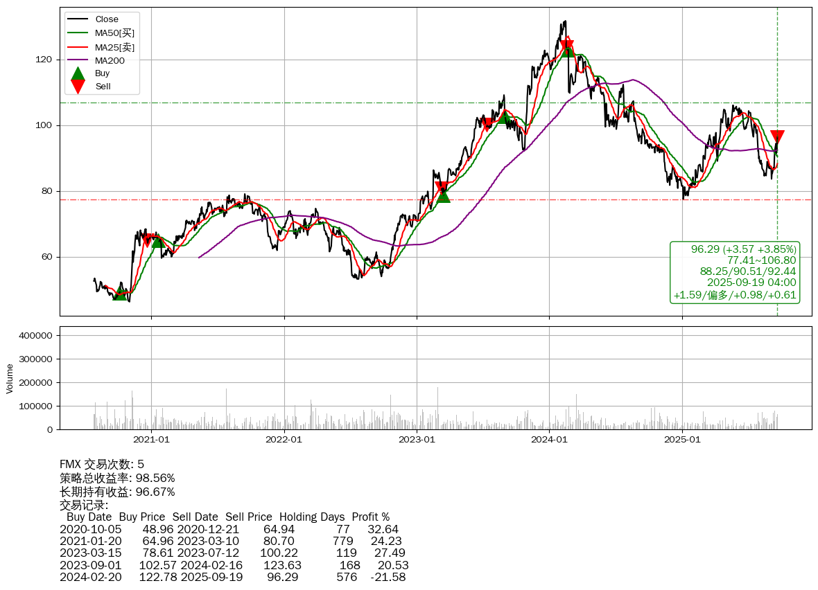 | 42 | FMX | +98.56% | +96.67% | +1.89% | 5 | +1.59/偏多/+0.98/+0.61 | 2020-07-27~2025-09-19 |