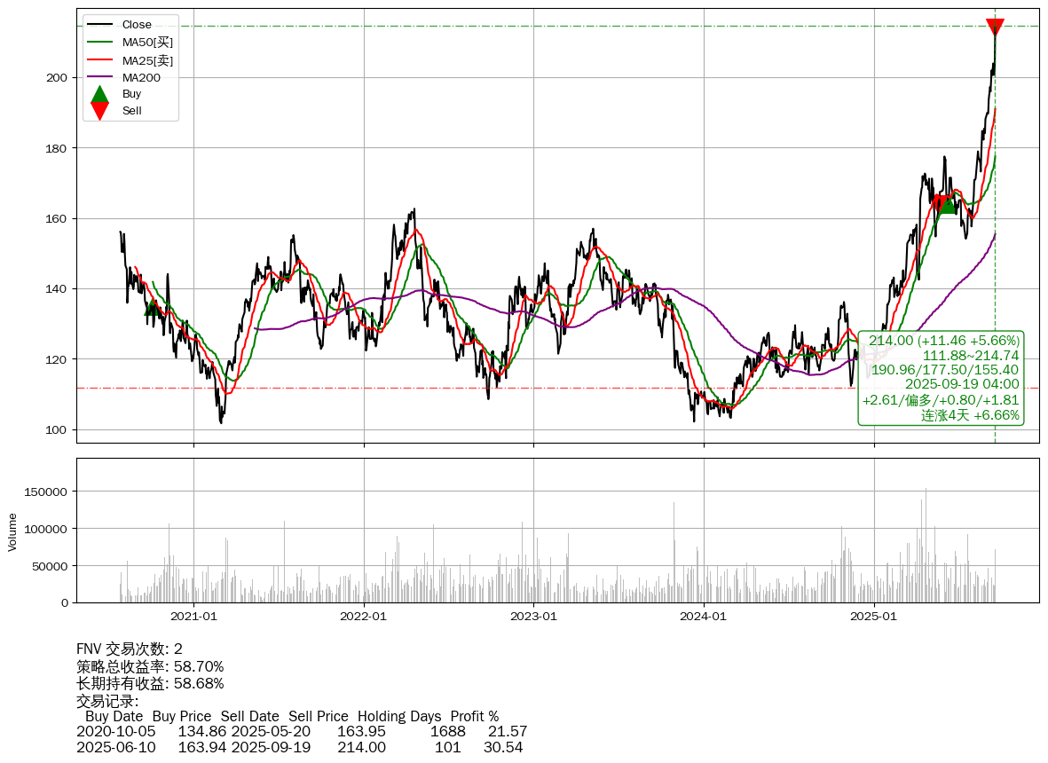 | 65 | FNV | +58.70% | +58.68% | +0.01% | 2 | +2.61/偏多/+0.80/+1.81 | 2020-07-27~2025-09-19 |