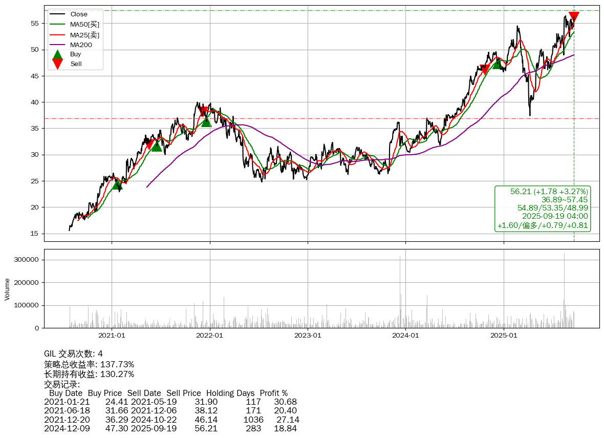 | 27 | GIL | +137.73% | +130.27% | +7.45% | 4 | +1.60/偏多/+0.79/+0.81 | 2020-07-27~2025-09-19 |
