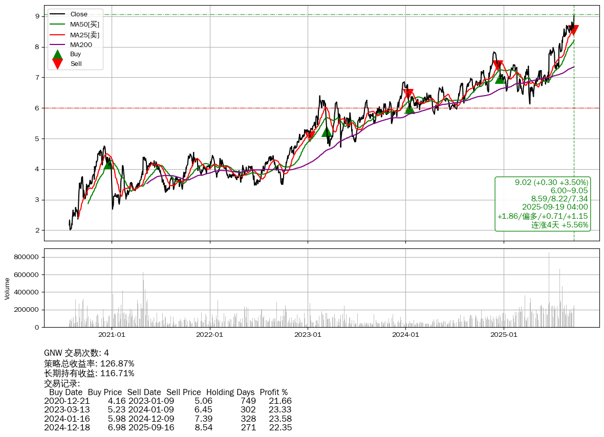 | 30 | GNW | +126.87% | +116.71% | +10.16% | 4 | +1.86/偏多/+0.71/+1.15 | 2020-07-27~2025-09-19 |
