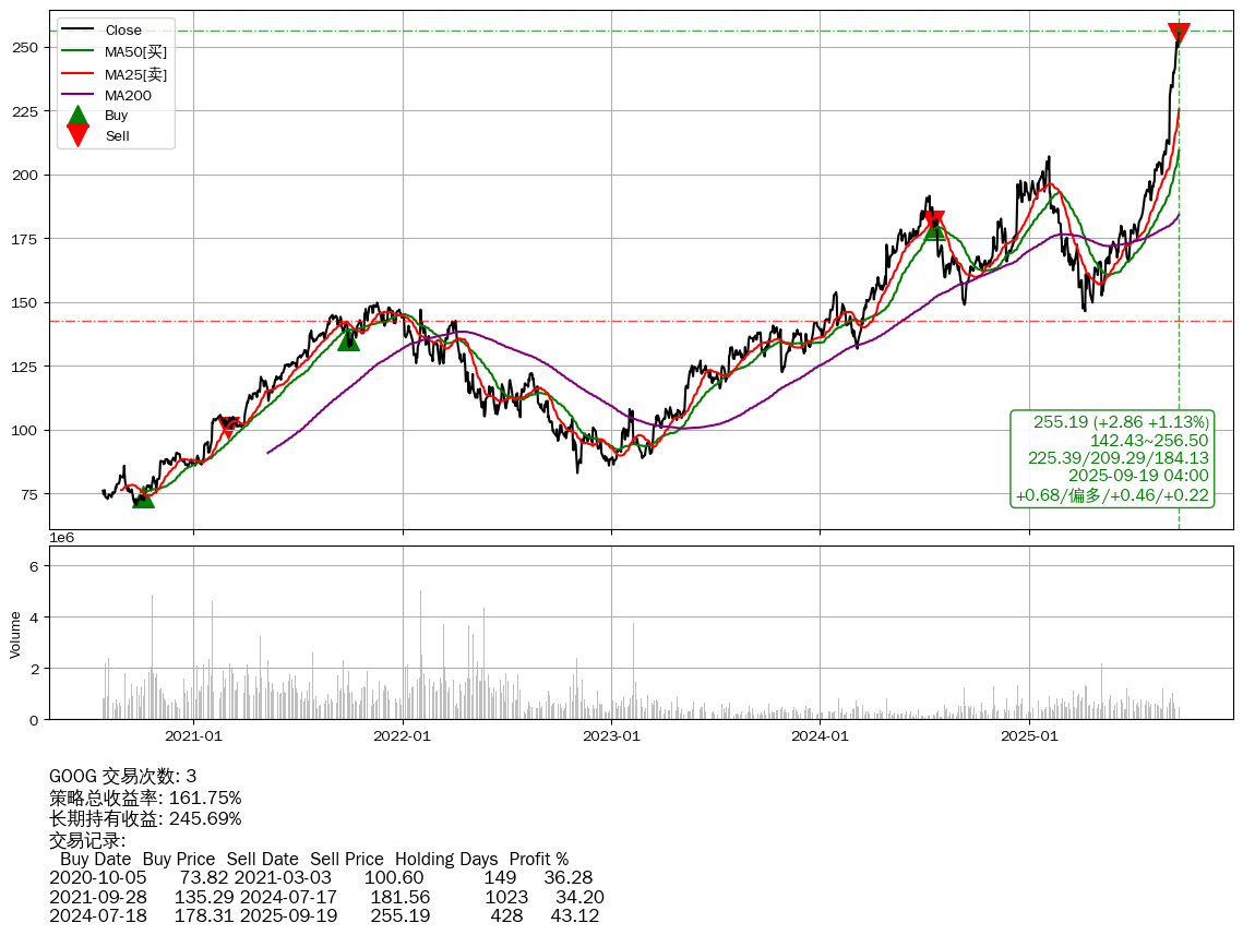| 24 | ★GOOG | +161.75% | +245.69% | -83.94% | 3 | +0.68/偏多/+0.46/+0.22 | 2020-07-27~2025-09-19 |
