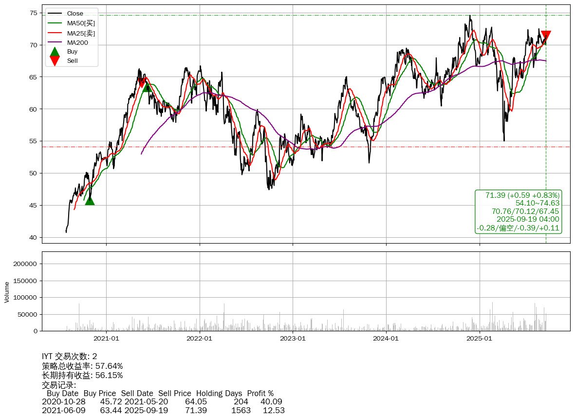 | 66 | IYT | +57.64% | +56.15% | +1.50% | 2 | -0.28/偏空/-0.39/+0.11 | 2020-07-27~2025-09-19 |
