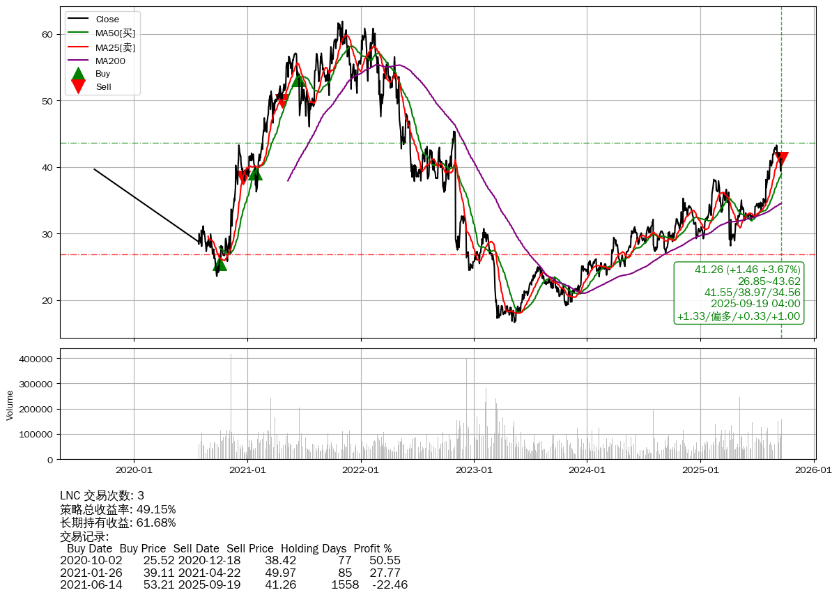 | 72 | LNC | +49.15% | +61.68% | -12.52% | 3 | +1.33/偏多/+0.33/+1.00 | 2019-08-26~2025-09-19 |