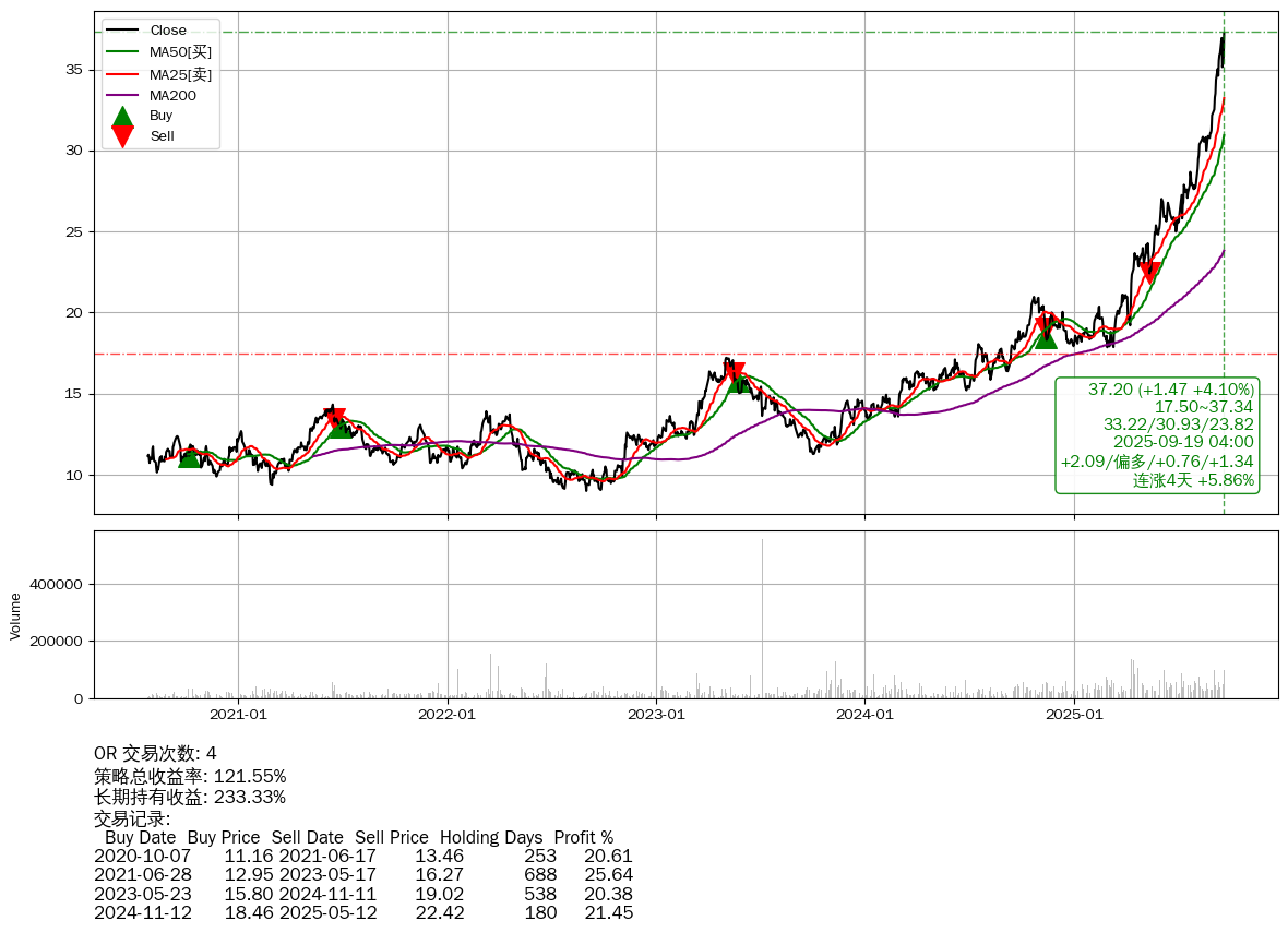 | 34 | OR | +121.55% | +233.33% | -111.79% | 4 | +2.09/偏多/+0.76/+1.34 | 2020-07-27~2025-09-19 |