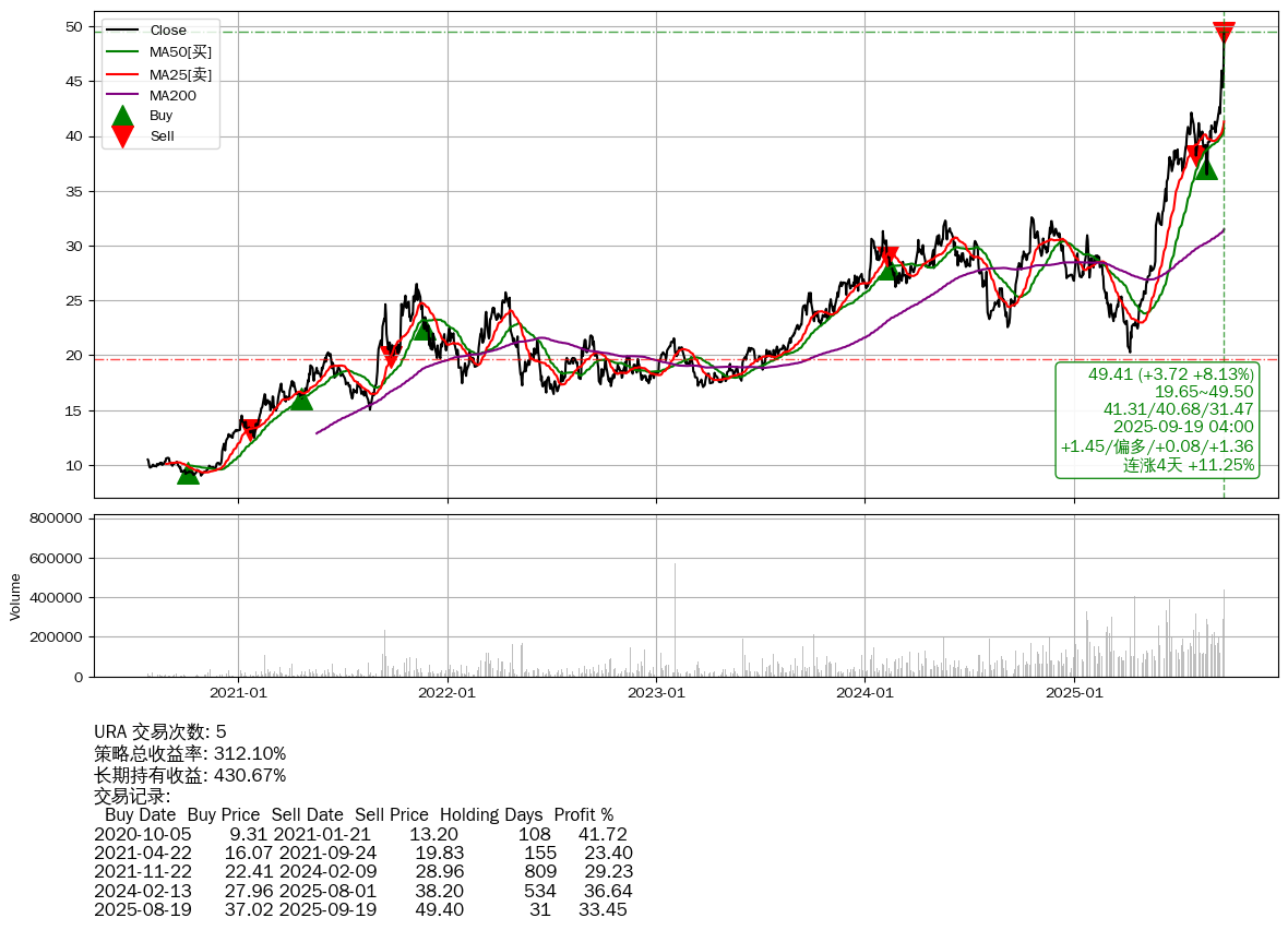 | URA | 2025-09-19 | 📈涨破 MA5 均线 📈连涨4天 +11.25% |
