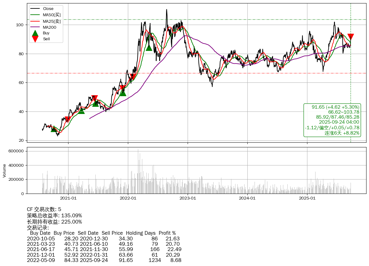 | 32 | CF | +135.09% | +225.00% | -89.91% | 5 | -1.12/偏空/+0.05/+0.78 | 2020-07-27~2025-09-24 |