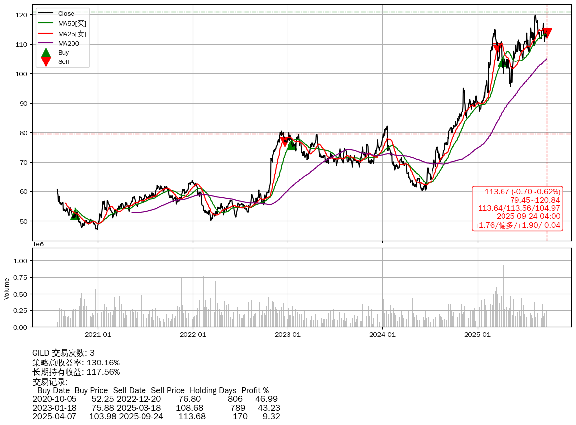 | 34 | GILD | +130.16% | +117.56% | +12.60% | 3 | +1.76/偏多/+1.90/-0.04 | 2020-07-27~2025-09-24 |