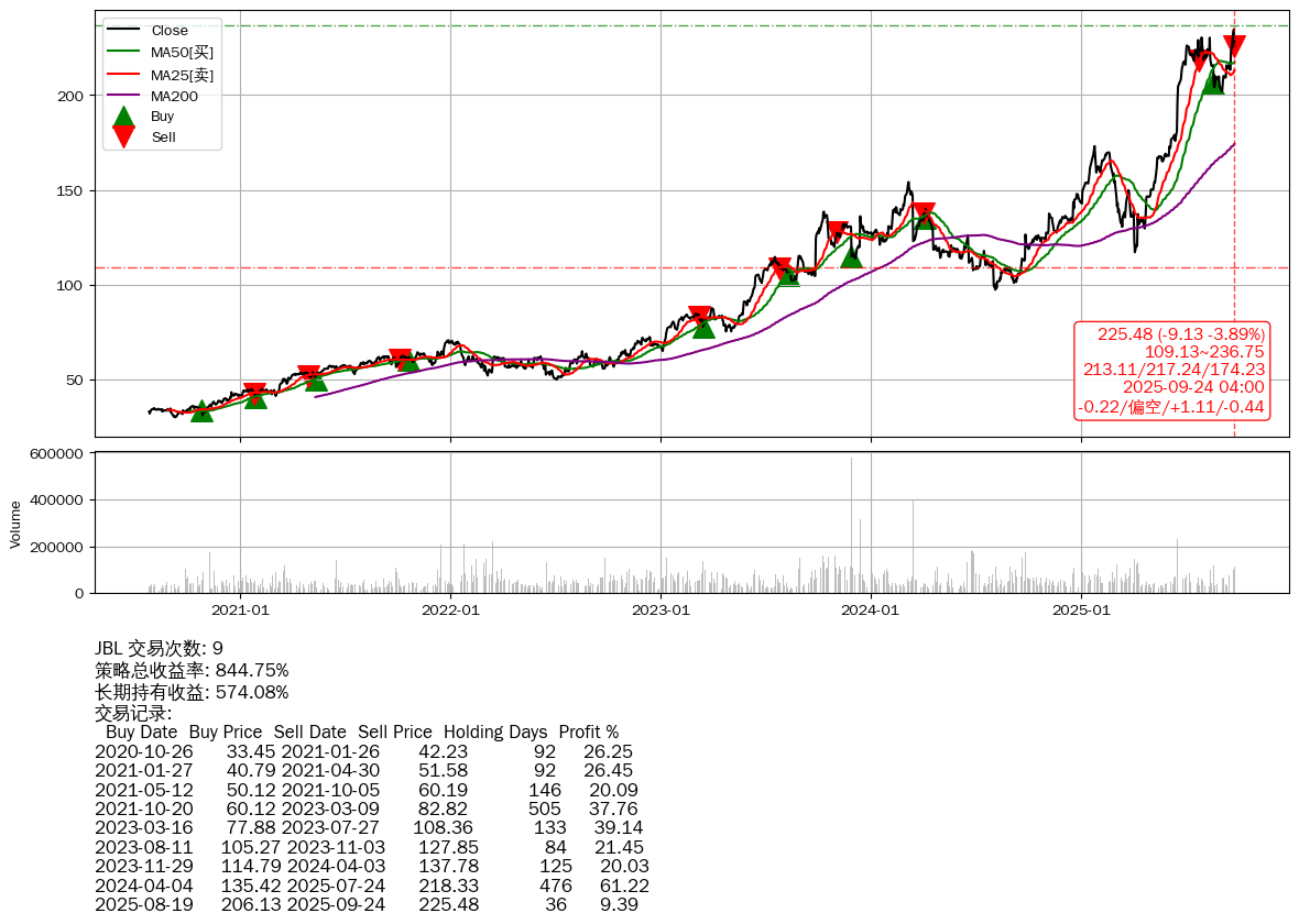 | 4 | JBL | +844.75% | +574.08% | +270.67% | 9 | -0.22/偏空/+1.11/-0.44 | 2020-07-27~2025-09-24 |