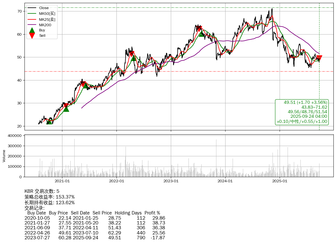 | 28 | KBR | +153.37% | +123.62% | +29.74% | 5 | +0.10/中性/+0.55/+1.00 | 2020-07-27~2025-09-24 |