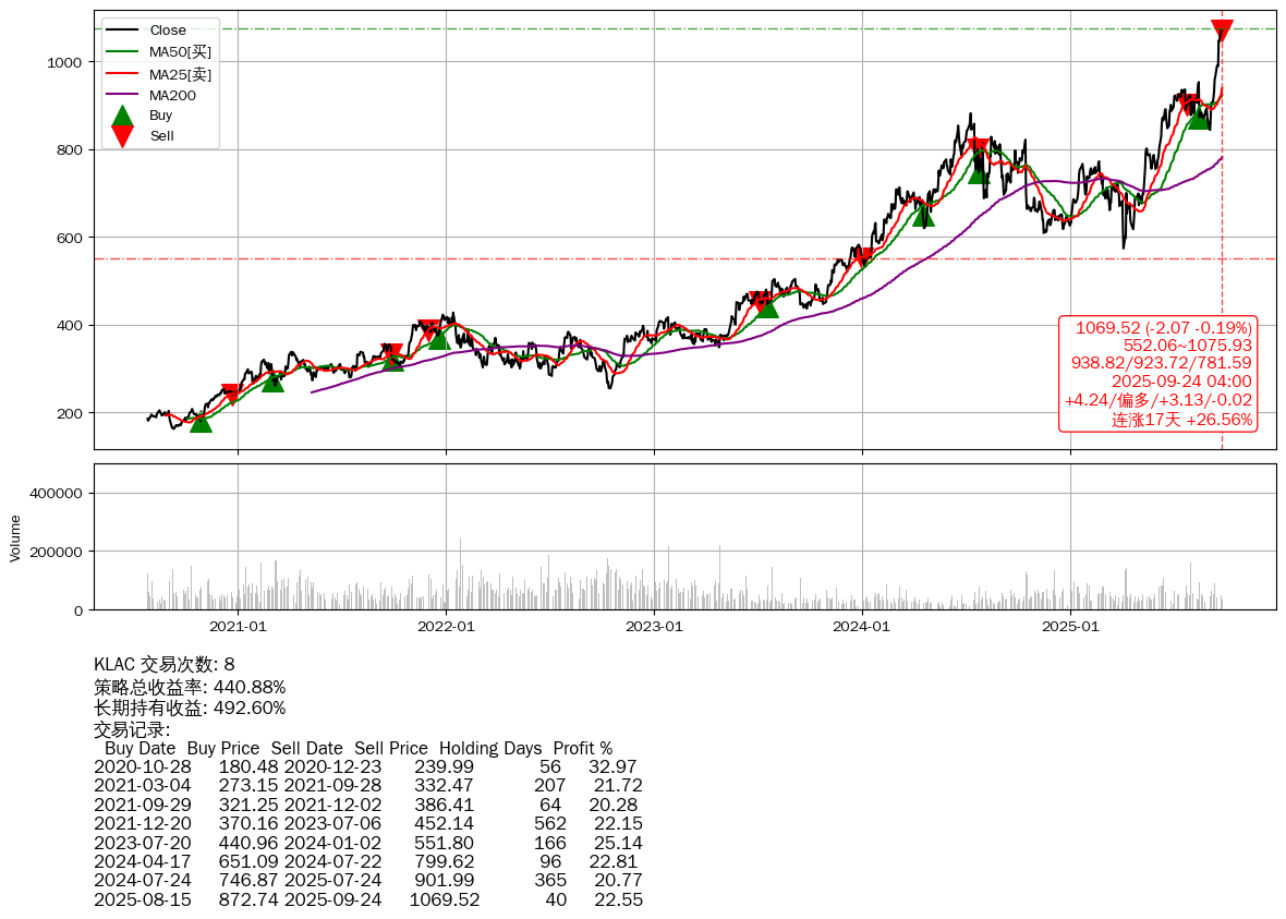| 6 | KLAC | +440.88% | +492.60% | -51.71% | 8 | +4.24/偏多/+3.13/-0.02 | 2020-07-27~2025-09-24 |