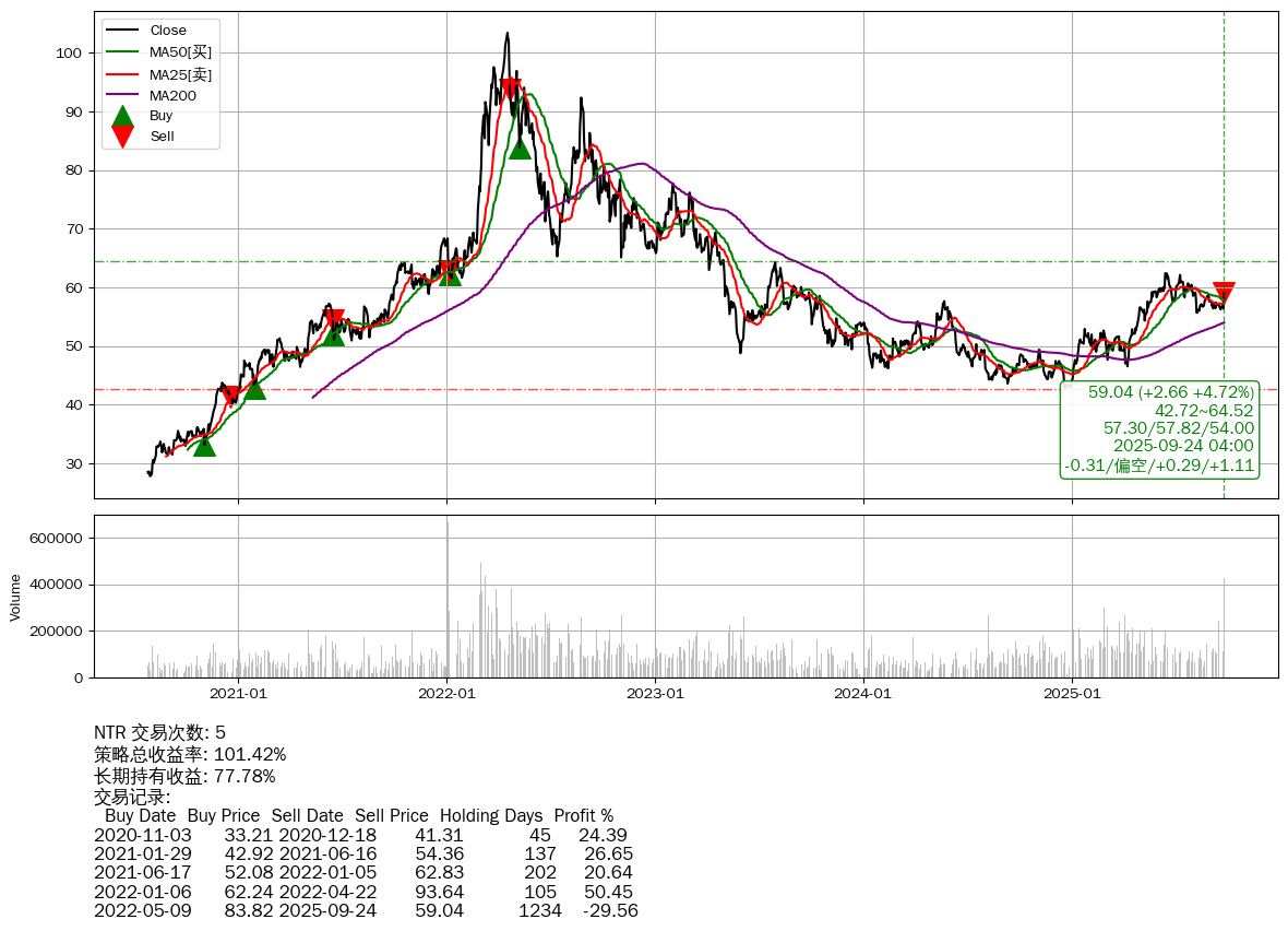 | 49 | NTR | +101.42% | +77.78% | +23.64% | 5 | -0.31/偏空/+0.29/+1.11 | 2020-07-27~2025-09-24 |