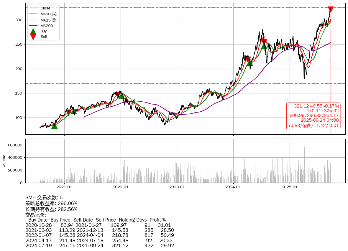 | 10 | ★SMH | +296.06% | +282.56% | +13.50% | 5 | +0.83/偏多/+1.42/-0.01 | 2020-07-27~2025-09-24 |