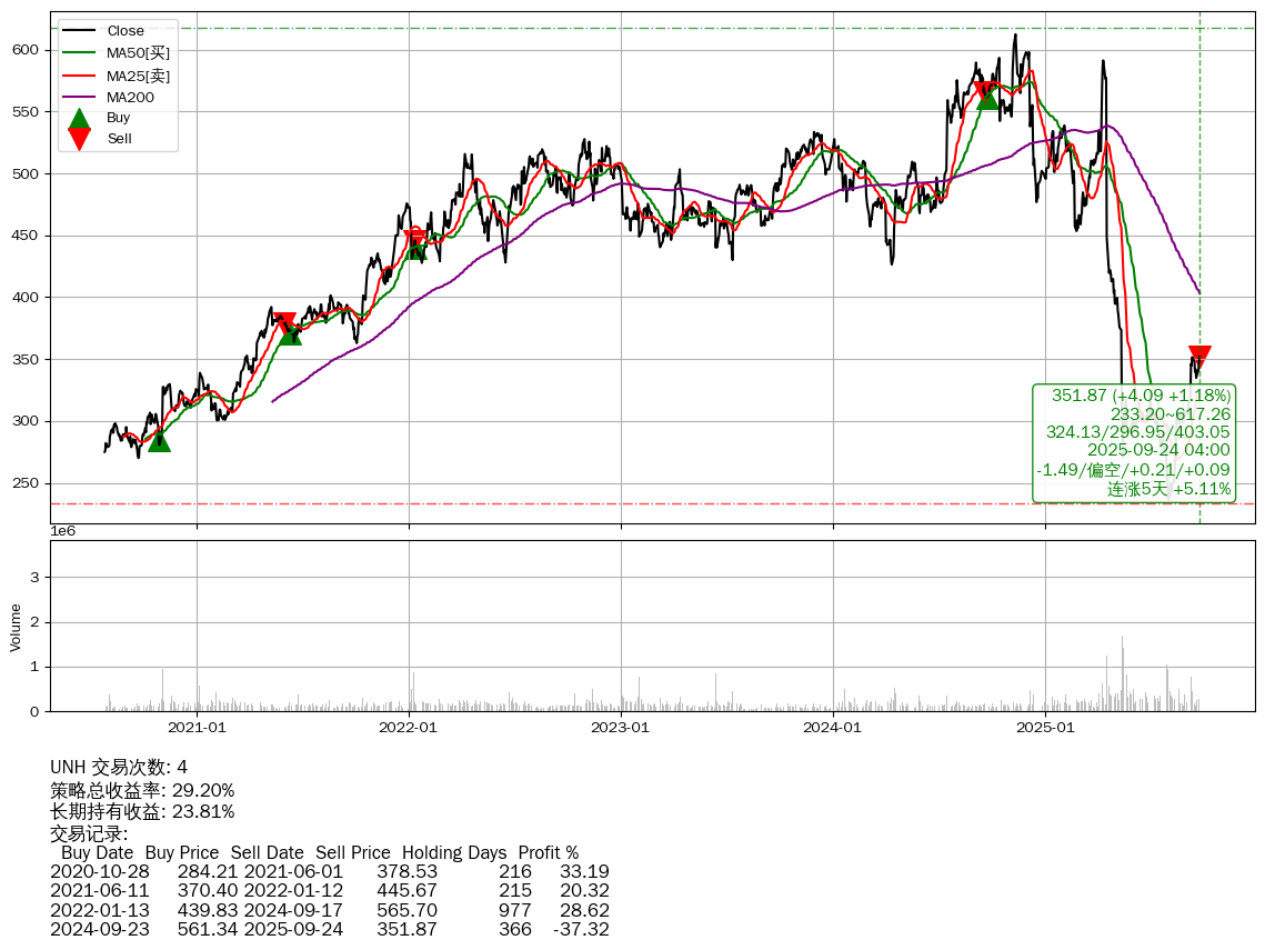 | 70 | ★UNH | +29.20% | +23.81% | +5.39% | 4 | -1.49/偏空/+0.21/+0.09 | 2020-07-27~2025-09-24 |
