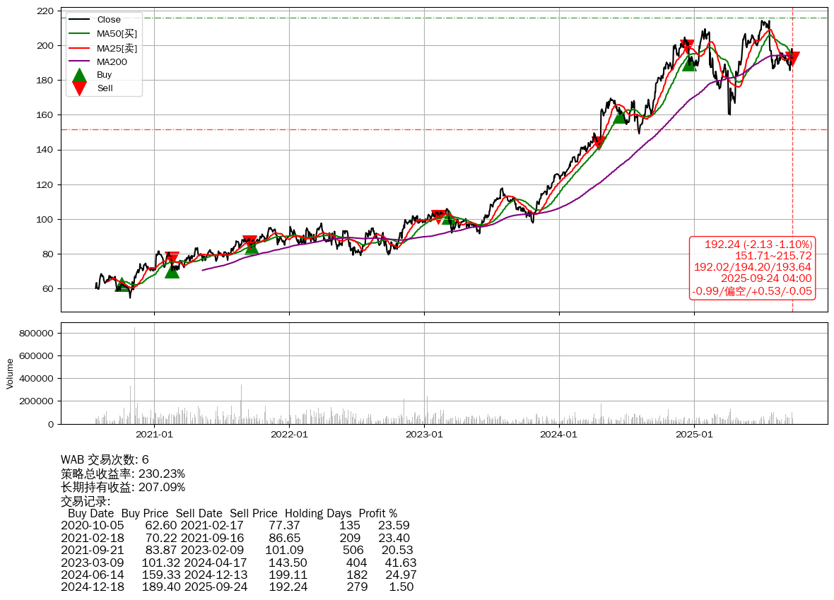 | 15 | WAB | +230.23% | +207.09% | +23.14% | 6 | -0.99/偏空/+0.53/-0.05 | 2020-07-27~2025-09-24 |