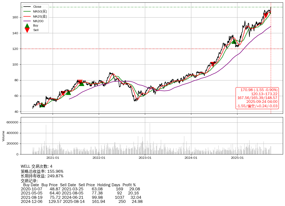 | 26 | WELL | +155.96% | +249.87% | -93.91% | 4 | -1.55/偏空/+0.24/-0.03 | 2020-07-27~2025-09-24 |