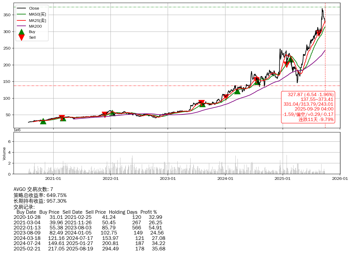 | 6 | ★AVGO | +649.75% | +957.30% | -307.55% | 7 | -1.59/偏空/+0.29/-0.17 | 2020-07-27~2025-09-29 |