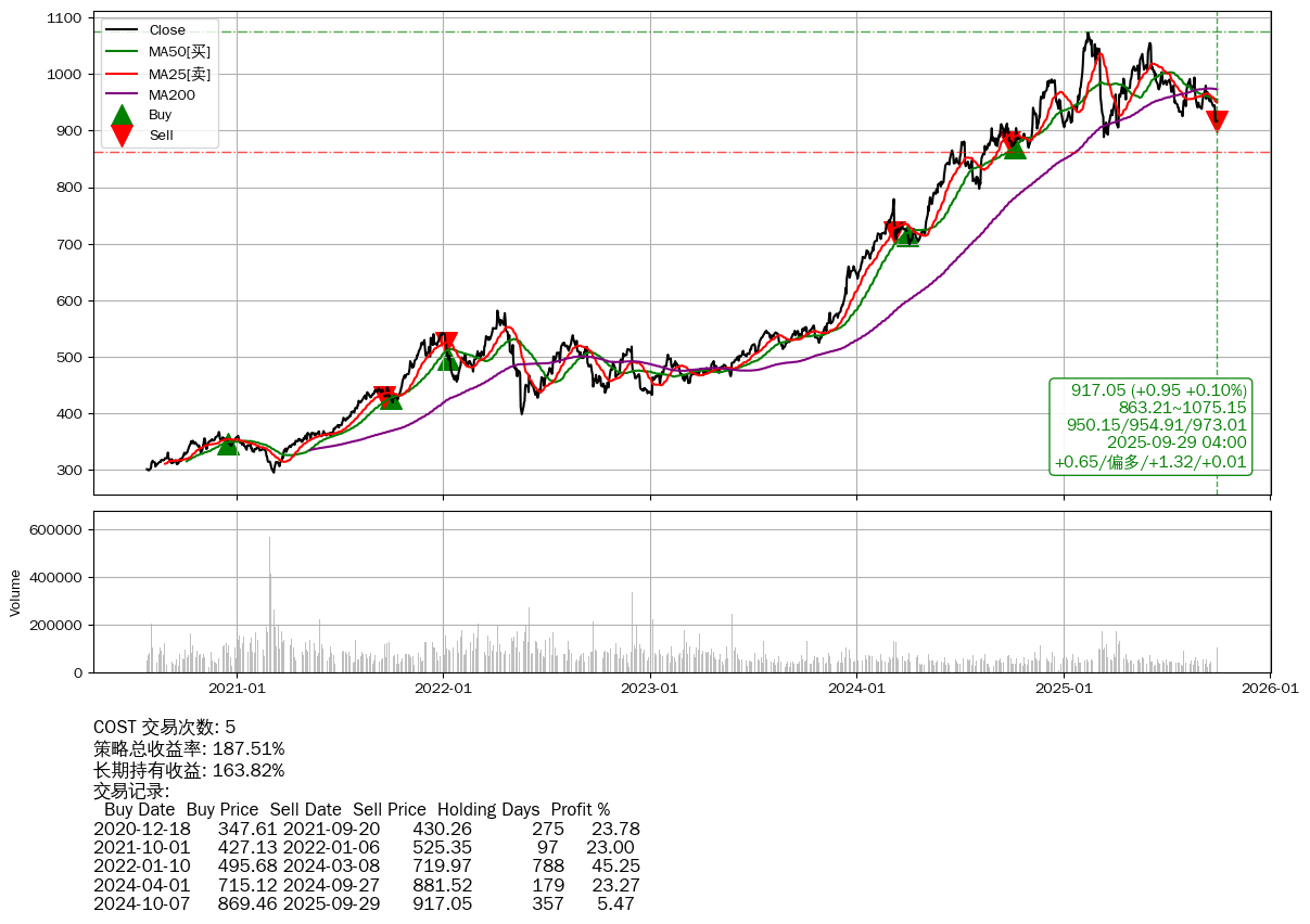 | 17 | ★COST | +187.51% | +163.82% | +23.70% | 5 | +0.65/偏多/+1.32/+0.01 | 2020-07-27~2025-09-29 |
