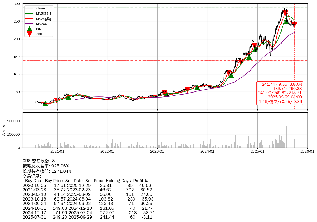 | 4 | ★CRS | +925.96% | +1271.04% | -345.08% | 8 | -1.46/偏空/+0.45/-0.36 | 2020-07-27~2025-09-29 |
