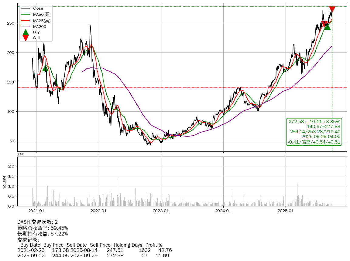 | 56 | DASH | +59.45% | +57.22% | +2.23% | 2 | -0.41/偏空/+0.54/+0.51 | 2020-12-09~2025-09-29 |