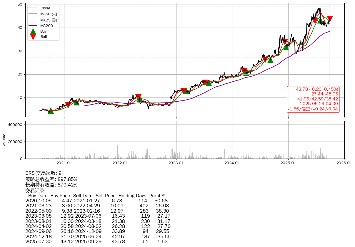 | 5 | ★DRS | +897.85% | +879.42% | +18.43% | 9 | -1.56/偏空/+0.24/-0.04 | 2020-07-27~2025-09-29 |
