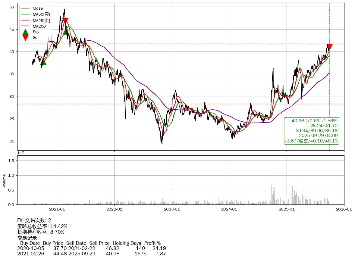 | 65 | ★FXI | +14.42% | +8.70% | +5.72% | 2 | -1.67/偏空/+0.10/+0.13 | 2020-07-27~2025-09-29 |