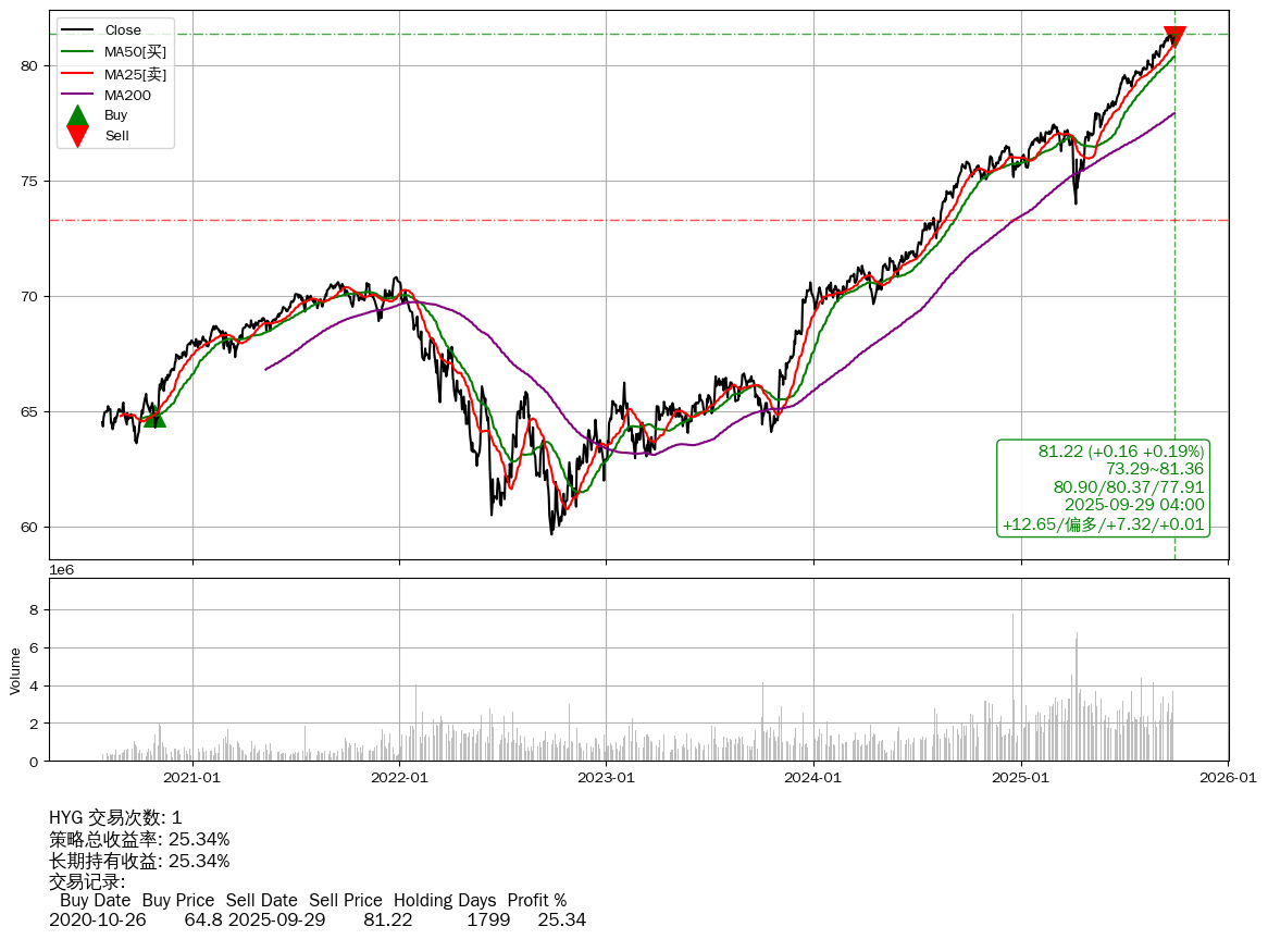| 64 | ★HYG | +25.34% | +25.34% | +0.00% | 1 | +12.65/偏多/+7.32/+0.01 | 2020-07-27~2025-09-29 |