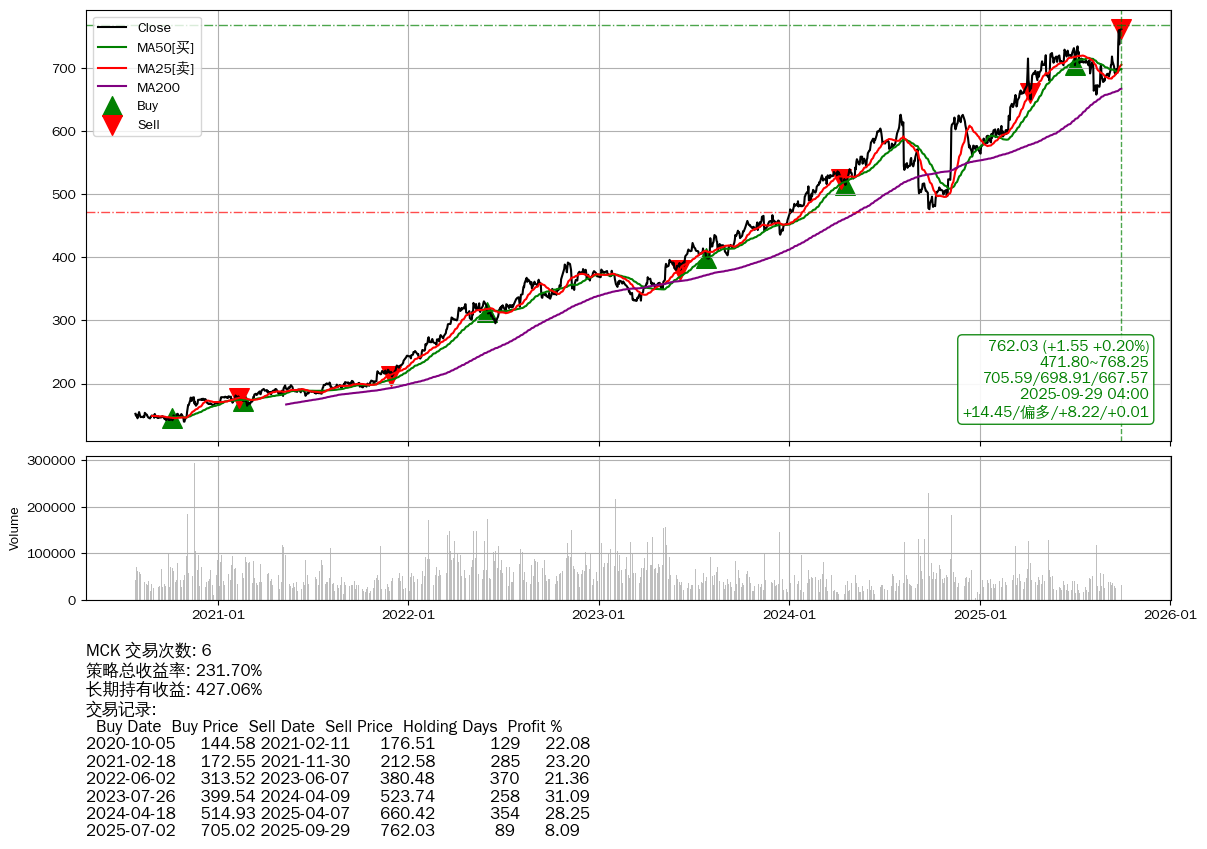 | 13 | ★MCK | +231.70% | +427.06% | -195.37% | 6 | +14.45/偏多/+8.22/+0.01 | 2020-07-27~2025-09-29 |