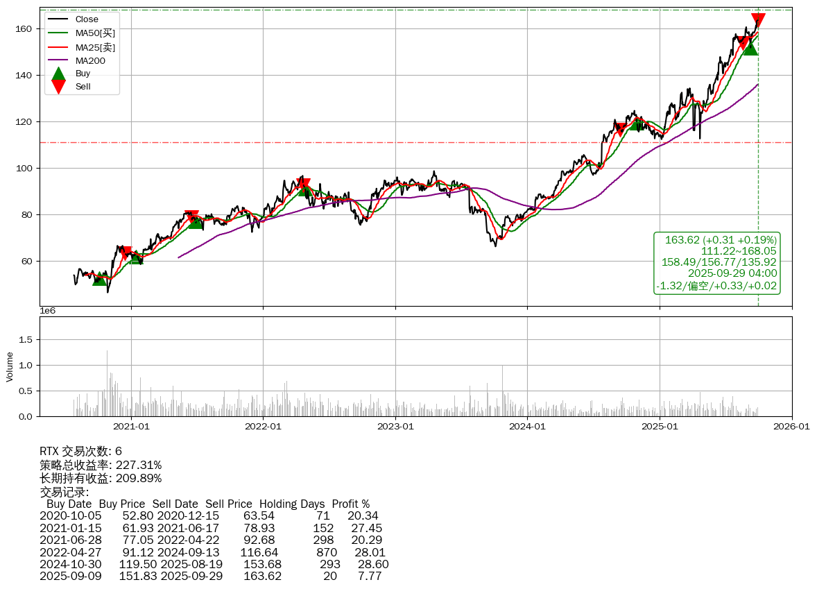 | 14 | ★RTX | +227.31% | +209.89% | +17.43% | 6 | -1.32/偏空/+0.33/+0.02 | 2020-07-27~2025-09-29 |