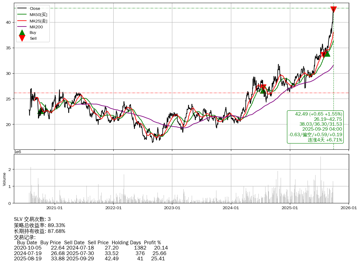 | 44 | ★SLV | +89.33% | +87.68% | +1.65% | 3 | -0.63/偏空/+0.59/+0.19 | 2020-07-27~2025-09-29 |