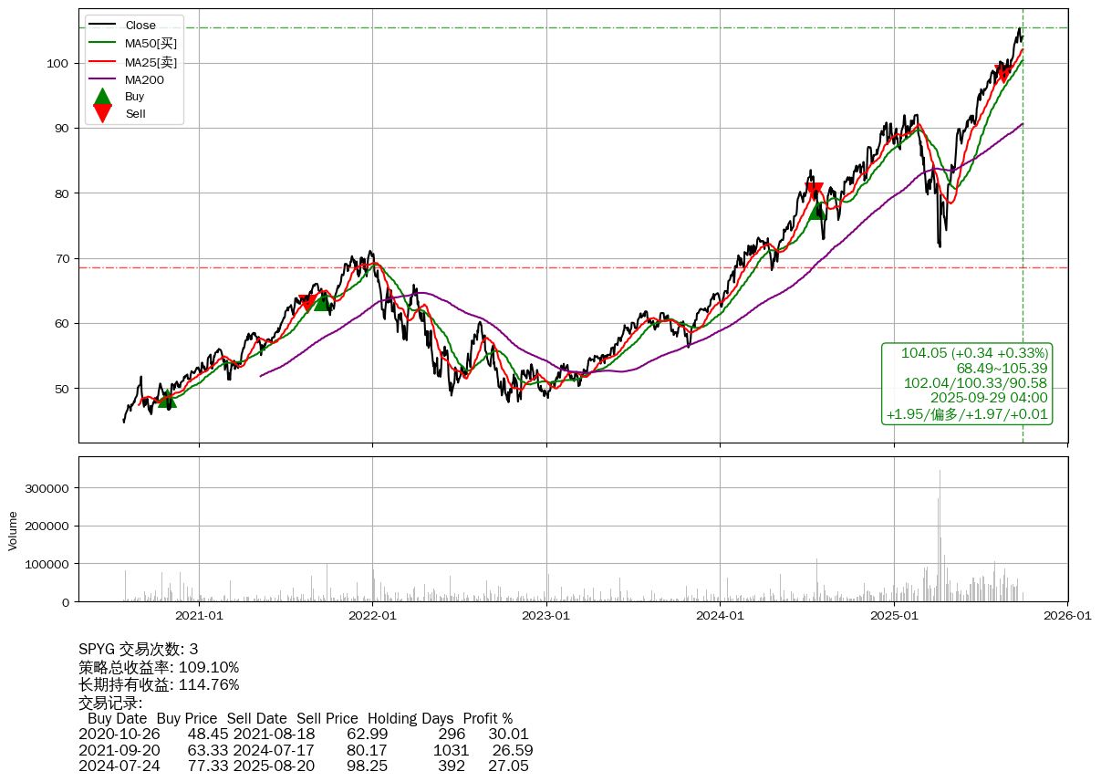 | 37 | ★SPYG | +109.10% | +114.76% | -5.66% | 3 | +1.95/偏多/+1.97/+0.01 | 2020-07-27~2025-09-29 |